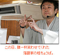 たとえば乗る前の諸注意なんてのは本来からいって面白いものではないのだが、新進落語家の手?(口)にかかると、「そんなことされたら、かなわんな……」「往生しまっせ」と、聞く方が思わず笑ってしまうのだ。全てがこんな調子だから知らぬ間に落語家の手の内に踊らされた乗客は終始、目から泪を流し、船内で腹をよじって笑い続けてしまう。さらに乗客がツッコミを入れれば入れるほど、落語家はボケるから、笑いのボルテージは更に上がる。(婦人会や町内会など団体で船を貸切ると誰に気兼ね