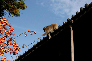 猿は柿を狙って柱を伝い屋根に向かったが、