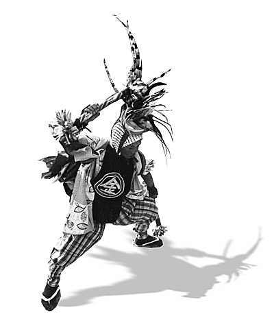 金蔵のいでたちは顔に天狗面をつけ、頭には鶏毛冠をいただき、