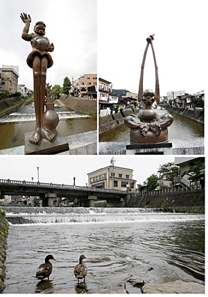 写真/手長、足長像の下を流れる清澄な宮川には、水鳥や鯉がたむろしている。
