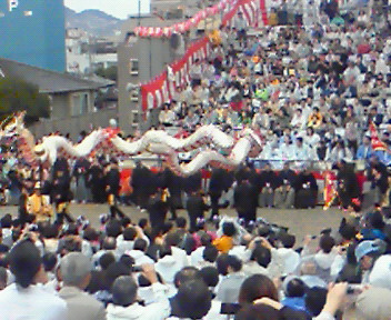長崎くんち祭り 2009/10/7 添乗員の旅ブログ 毎年10月7・8・9日に開催される国指定の重要無形文化財になっている「長崎くんち」に来ています。写真は一番のハイライトになる龍踊りです。観客は、アンコ ールの意味である「モッテコーイ」の掛け声ですごい盛り上がりです。添乗/taue