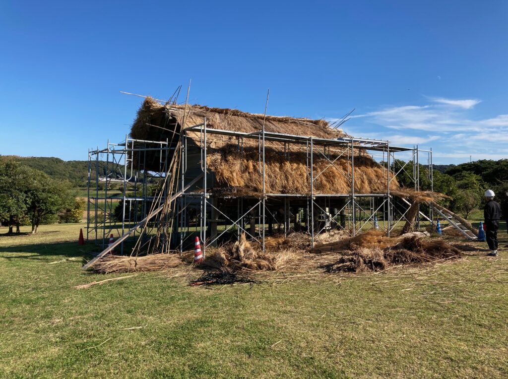 丁度萱葺きの作業中でした!!これができる職人さんが少なくなっているため、とても貴重な方だそうです![]()