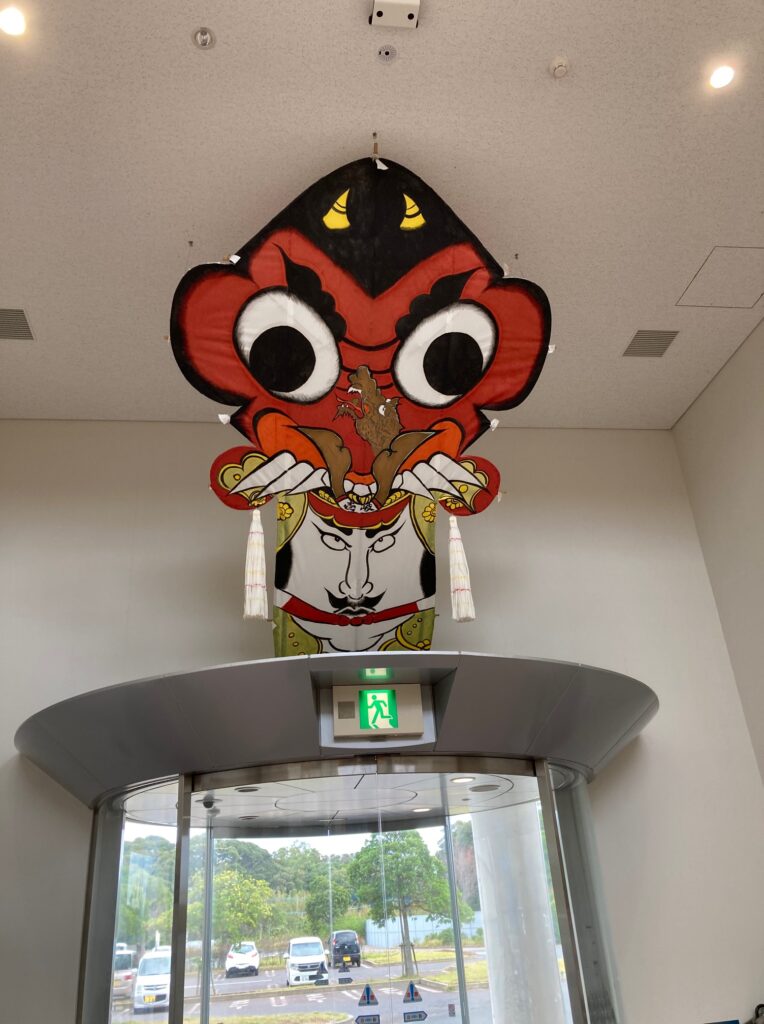 ”昔々、壱岐は、“鬼”がたくさん住んでいた鬼ヶ島だったそうな。鬼は、島を我が物顔で荒らしまくり、島に住む人を苦しめていたらしい。その鬼の悪行を見かねた豊後国(=ぶんごこく 現大分県)の若武者百合若大臣(ゆりわかだいじん)が壱岐に鬼退治にやってきた。百合若大臣は、壱岐に着くやいなや、次々と鬼に切りかかり、鬼をやっつけていった。最後に残った鬼の大将である「悪毒王(あくどくおう)」と相対した。悪毒王との激戦の末、百合若大臣は刀を振り下ろし、悪毒王の首を斬り落としました。斬り落とされた鬼の首は空中に舞い上がり、百合若大臣の兜(かぶと)に噛み付いたがそのまま、死んでしまった。その勇士の姿を描いたのが“鬼凧(おんだこ)”です。”