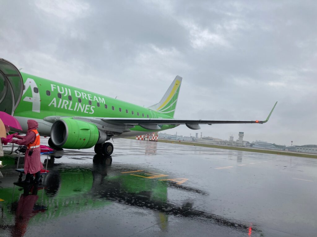 あいにくの雨の中、県営名古屋空港から熊本空港へ、今日は緑のFDA![]()