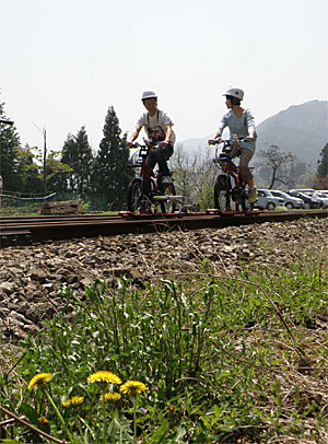 廃線を利用して改造した自転車で走っているのは