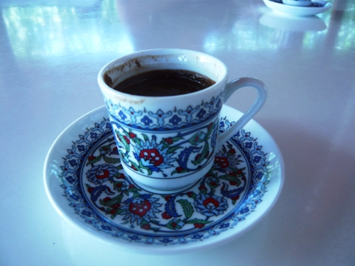 右側がドロドロのトルココーヒー。デミタスカップで飲みます。