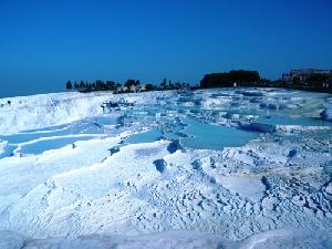 トルコブルーと言わんばかりの青空に、綿のように真っ白な石灰棚。