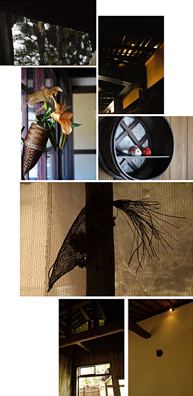 湯船におちる雫。いろり。露天風呂へつながる渡り廊下。