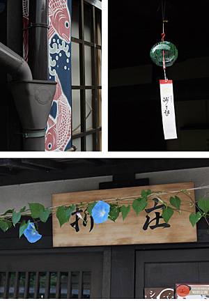 飛騨の細道 130-「たおやかな美」 2011/8/25 飛騨の細道 ■たおやかな美。 高山を終いの住処としている私が、 「ああ、高山っていいな」と感じるのは、 些細な風景の一片に触れたときだ。 そうしたものは得てして繊細で、こわれやすいものなのだが、 生活のなかから垣間みる美は「粋」なのものである。 木板看板の漢字と朝顔。 これは箱屋である。 店名をあしらった玄関前の風鈴は料亭。 障子戸の端にあしらった鯛の藍染めは民芸店と、 いずれも簡素な暮らしの中に咲く、一輪ざしの花のような、 たおやかな美を醸し出している。