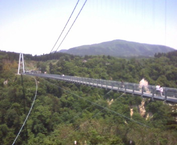 九重夢の吊り橋です。入場者数はもう700万人突破らしいです。橋のから見える滝と新緑がとても綺麗でした。連休明けで空いてました