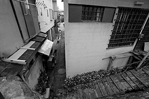 さらに戸板のような階段に続く路地で、