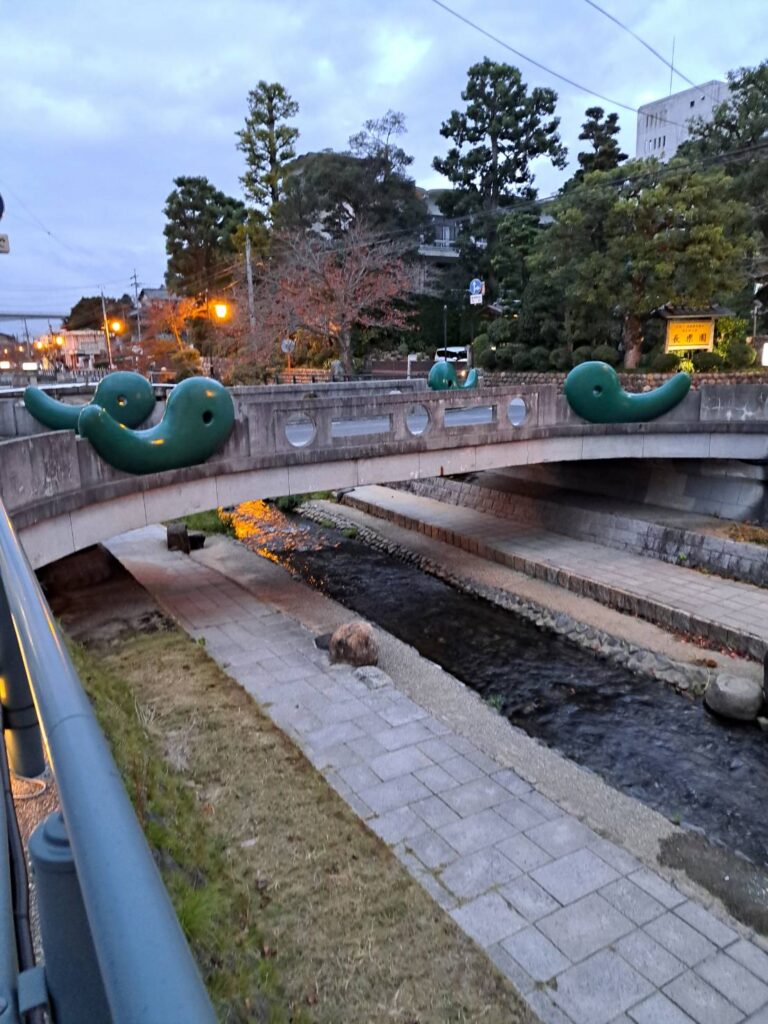 町並みの勾玉の橋や、温泉をミストにカエルボトルに詰めて化粧水として使う。最高なお土産![]()