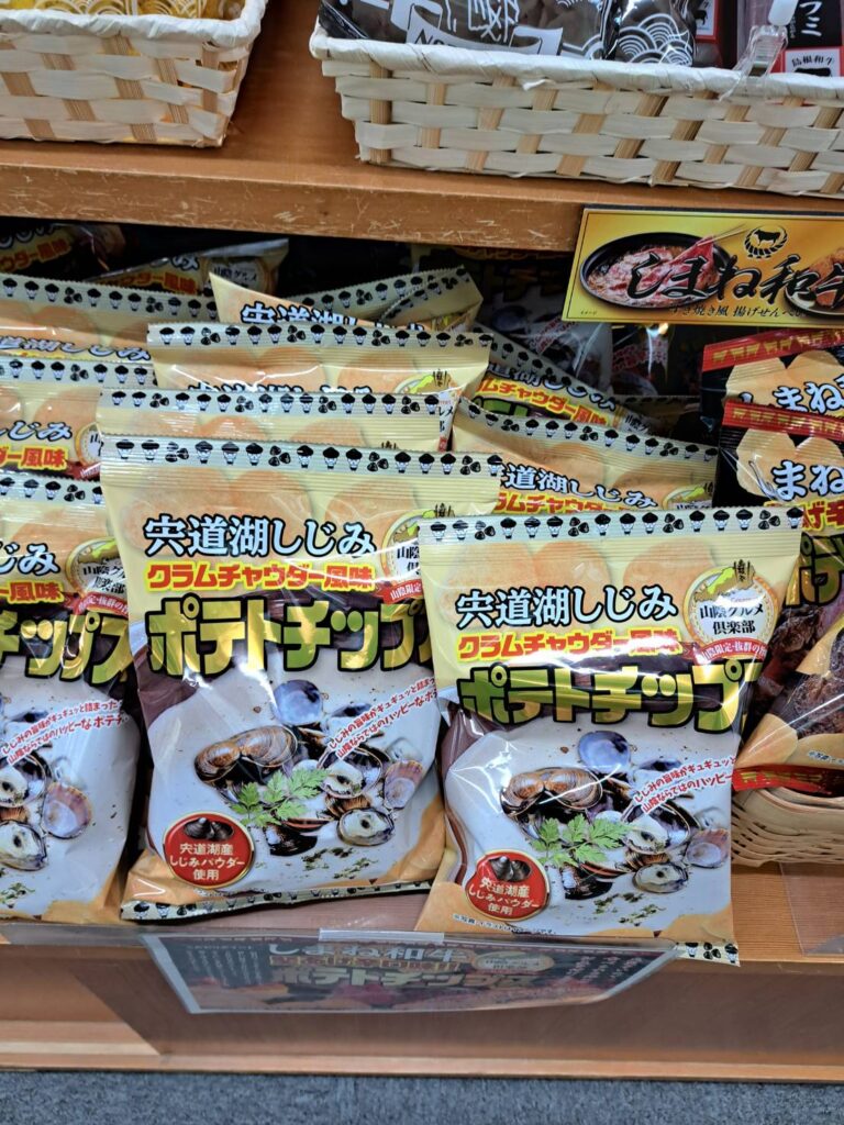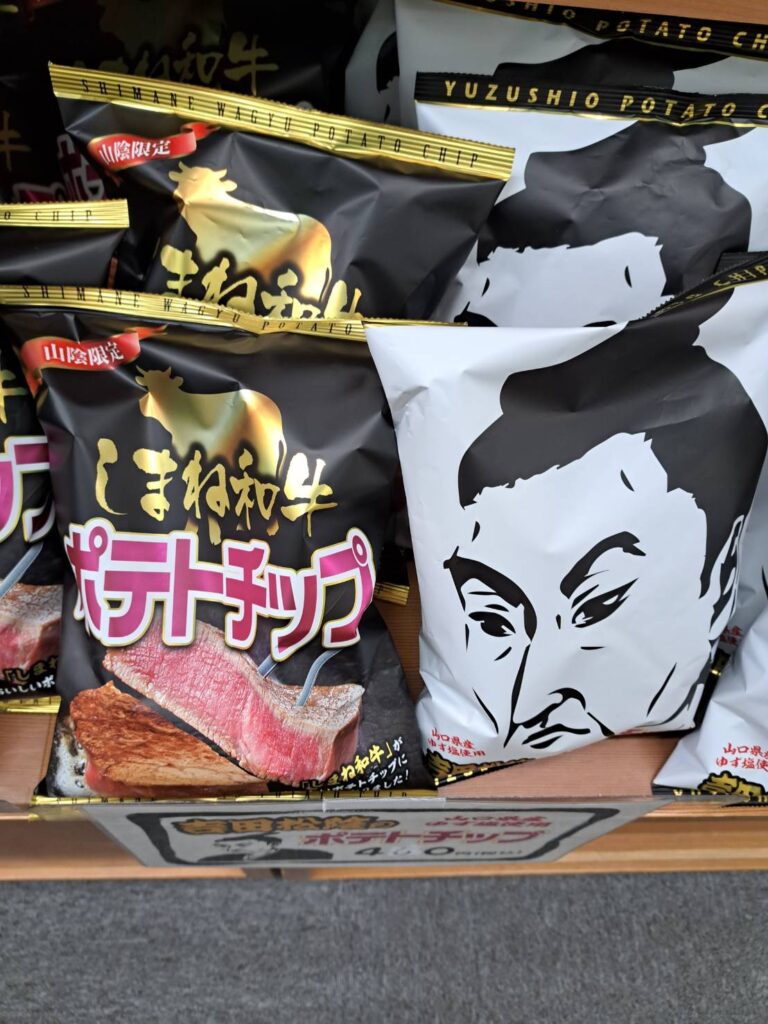島根のお土産は新しいものがいっぱいです。がご当地のポテトチップスに顔が載ってるのはウケる