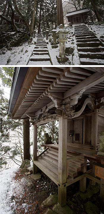 本殿から左を見下ろせば20mほどの下に渓流がながれ、