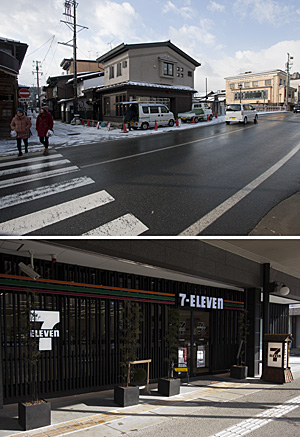 葛飾北斎漫画に登場する足長・手長像が鎮座するかじ橋は、
