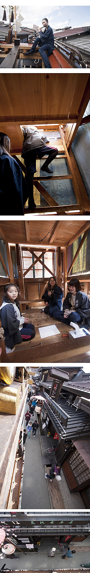春の高山祭り、「鳳凰䑓」の上で笛を吹くお囃子のメンバーである。