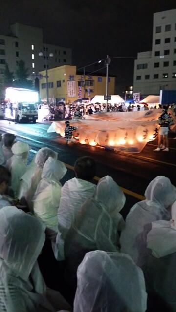 雨が降ってきた〜m( 。≧Д≦。)m 2014/8/5 添乗員の旅ブログ 3回目の竿燈演技開始直後、とうとう心配していた大粒の雨が!! でも大丈夫。 竿燈も、私達もレインコートを着て雨が止むのを待ちました。 そして!! 見事雨がやみました〜(*^^*) この後、4回目の竿燈演技が行われました!!