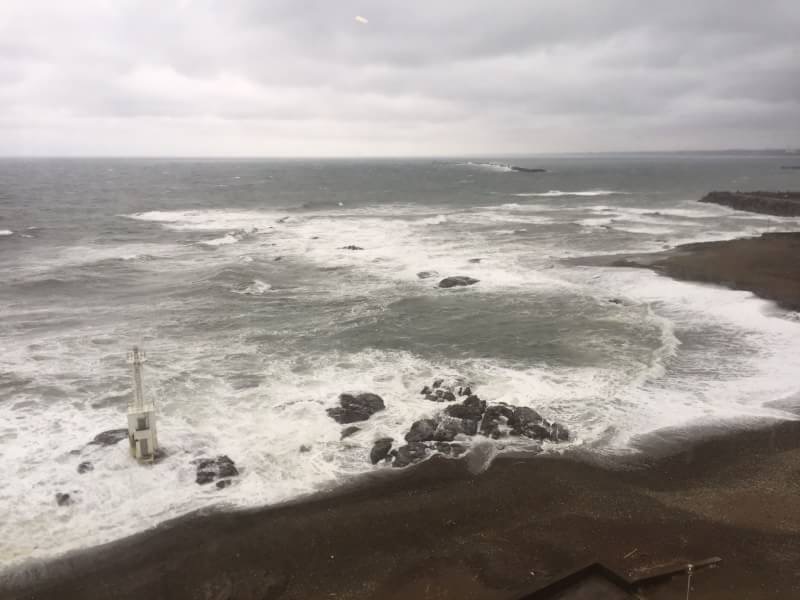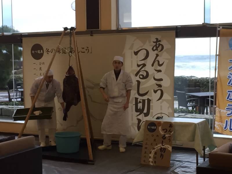 ここは目の前に海海海🚢荒れてます💦明日は雪らしい・・・💦💦そしてこのホテルではあんこうのつるし切りショーがあり