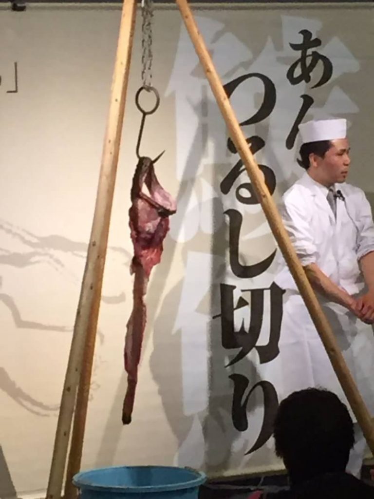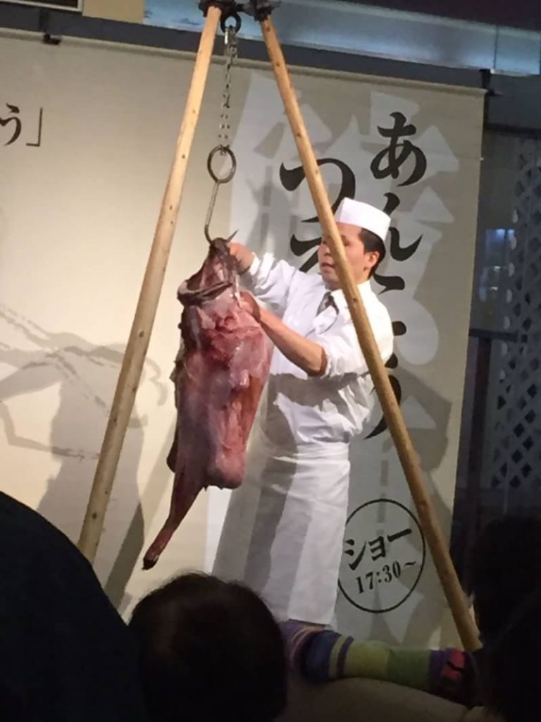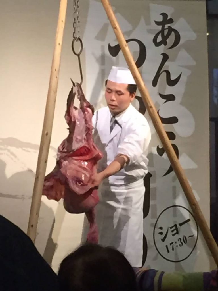 ゾ〜ッとしながら見学👩🏻👩🏻皮を剥がれてだんだん身を切られ、しまいには骨だけになった所を見てしまいました💦怖かった😭1999年から名物つるし切りショーやってます。ごちそうですよ🐟あん肝注文ありました🐟