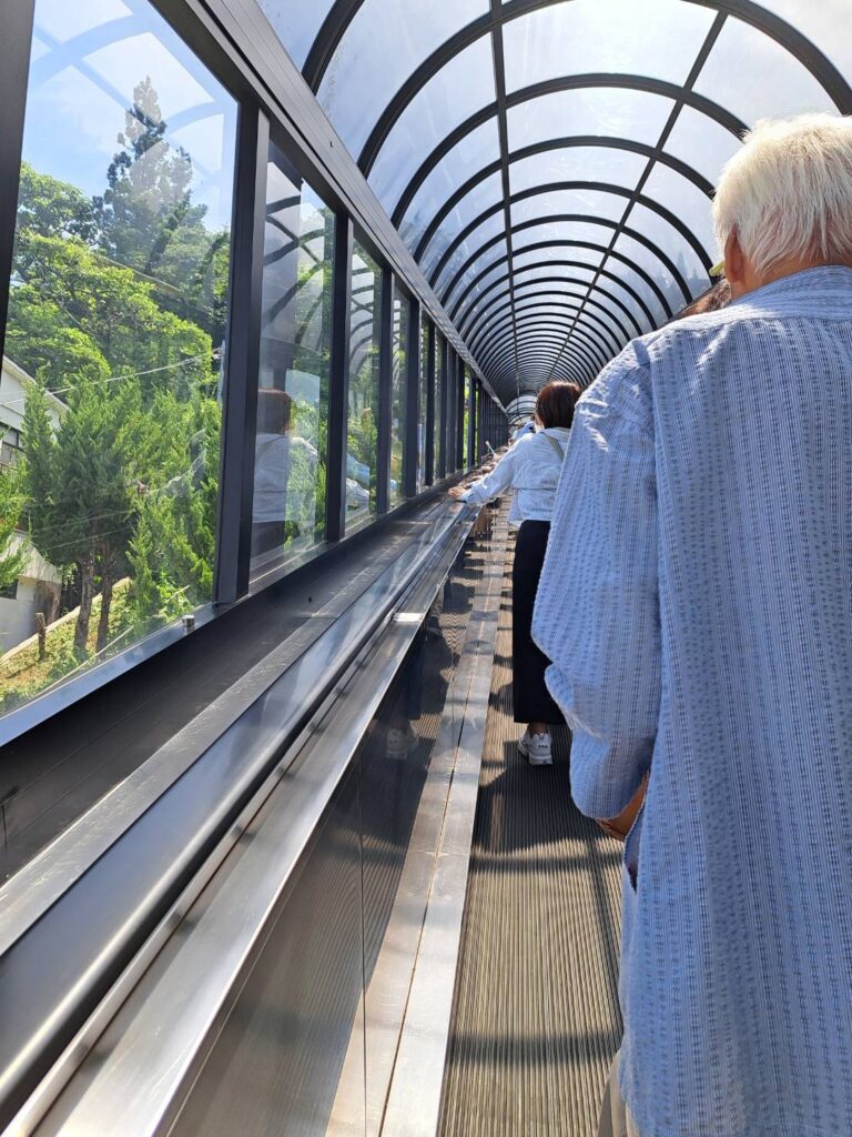 スロープコンベアという乗り物に、乗って先ずはお墓参りと自害をした兵士の場所を案内してから、さざえ堂へお参り。
