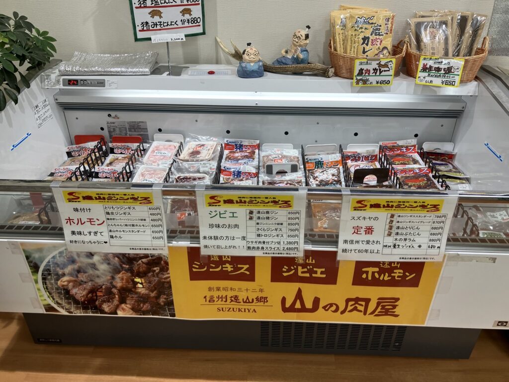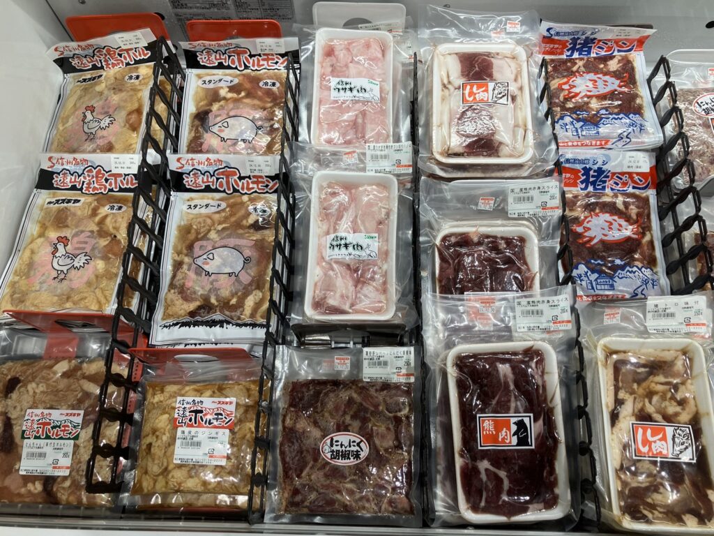 北海道では鹿肉ジャーキーをお土産に買い、トド肉の缶詰にびっくりしましたが、鹿やイノシシ、熊、ウサギ、信州もすごいです!!