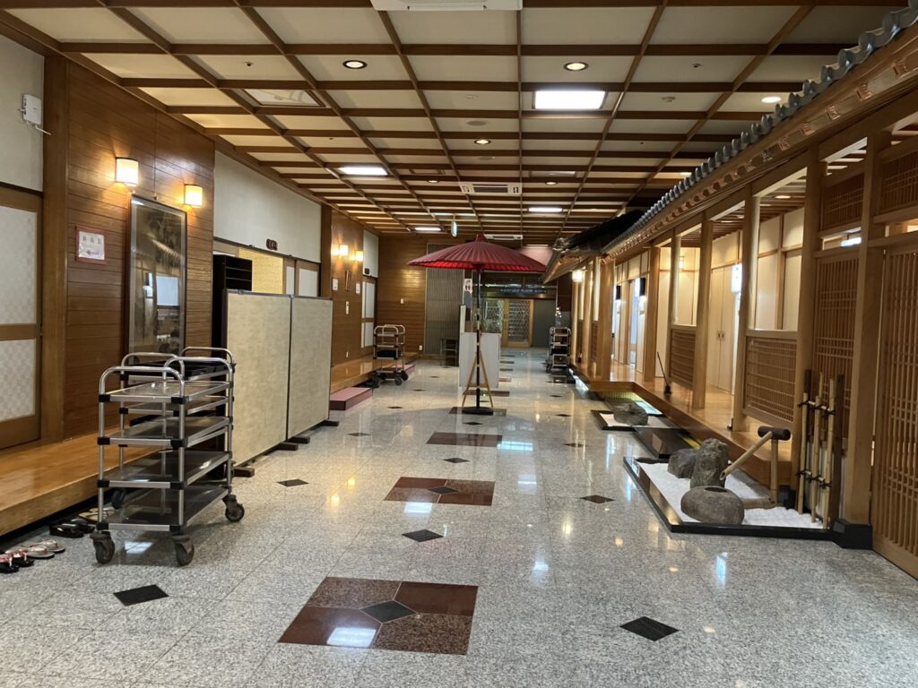 「女性大浴場で海外からのお客様が転倒して頭から突っ込まれてガラスが割れたので、大浴場に入場ができなくなっております!!申し訳ございません・・・。」