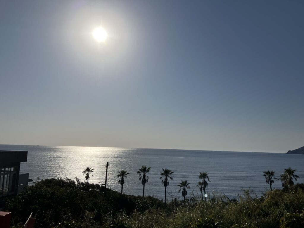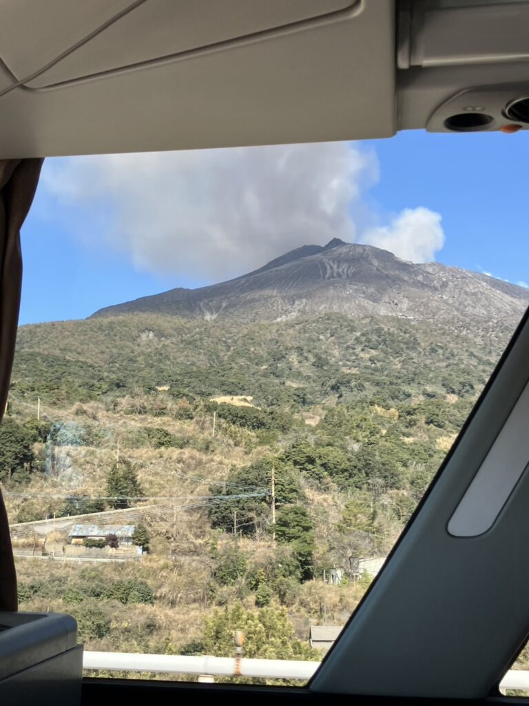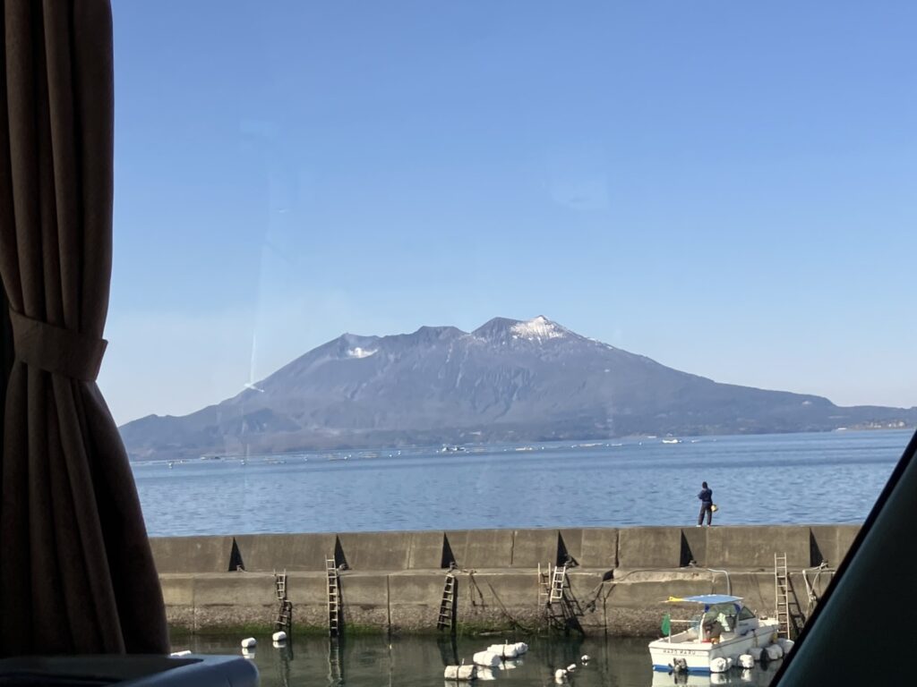 桜島が見えて来ました🏔️釣り人も多くいました。何か釣れるんだね🐟とガイドさん。と言っていると、海にカモメや鵜もたくさんいたので、確実に魚がいるね~🐟🐟🐟と、ドライバーさんも確信しておられました。