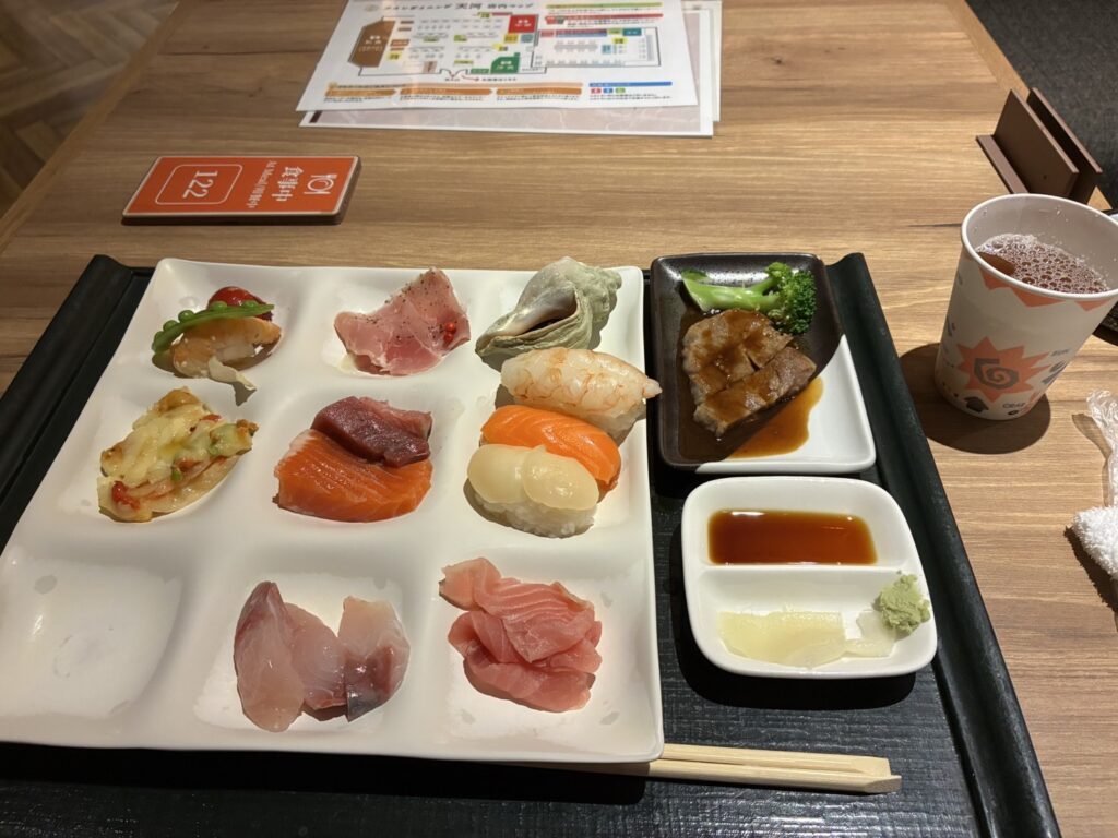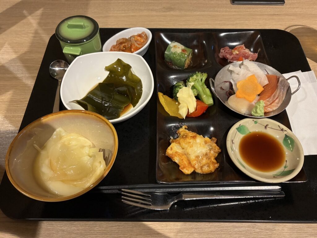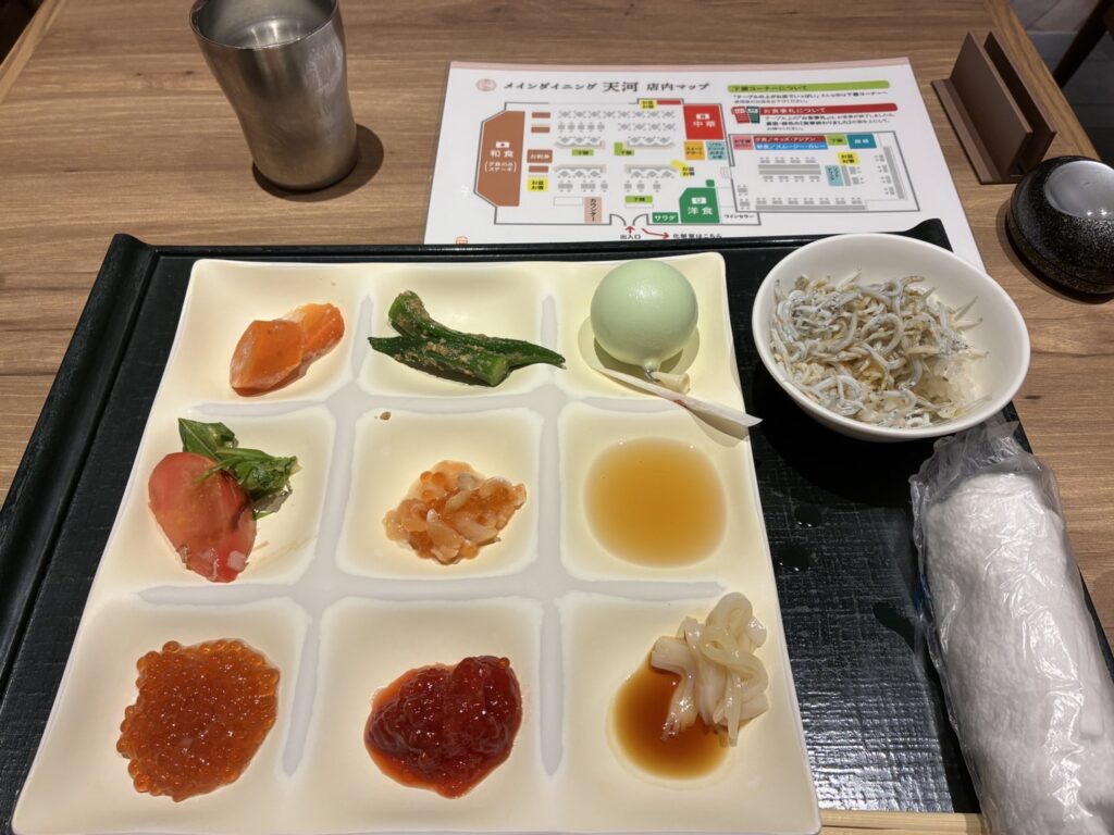 イカ刺し!!いくら山盛り!!緑の丸いのはまりもとうふです🍈朝食も和洋中たくさんあってボリューム満点です!!