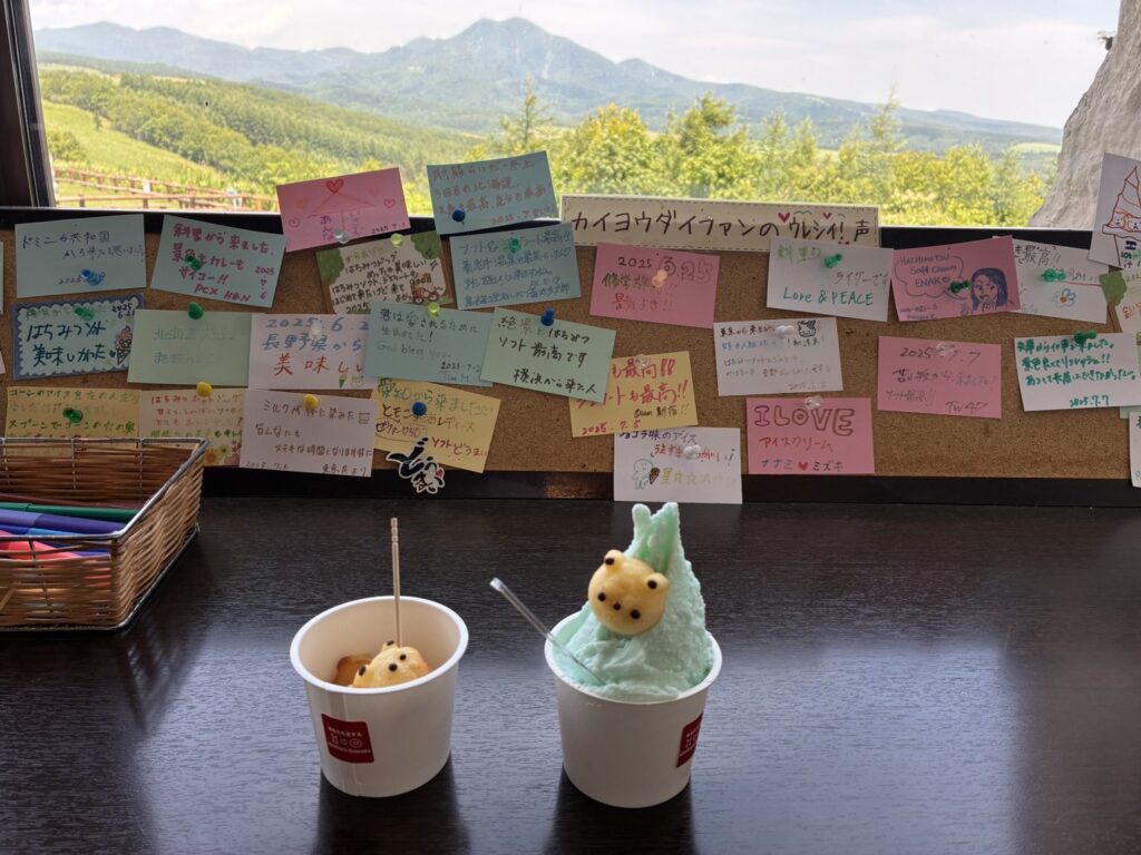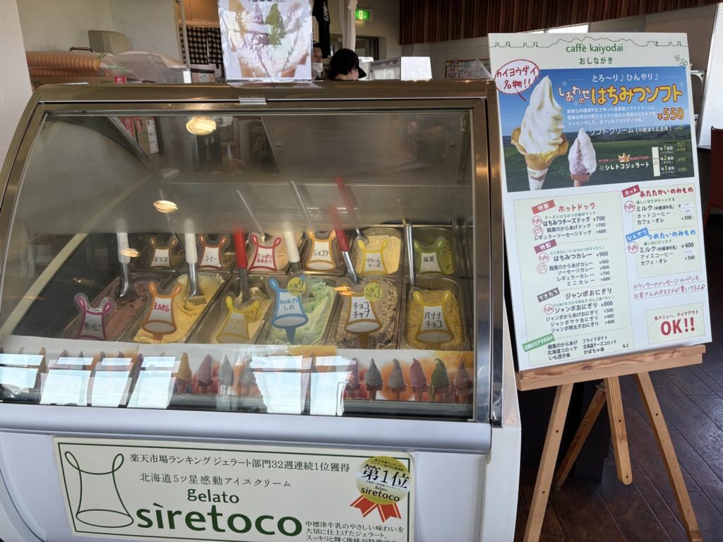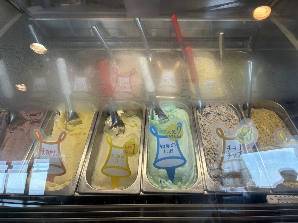 ネットで調べた時は(木)定休になっていた開陽台のアイスクリーム屋さん🍧行ったらやってたので速攻入りました!!(火)(水)休んだそうです。ラッキーでした✌️知床のしお味ジェラートにしました🍧本日の予想最高気温は34℃・・・22℃くらいだった釧路がもう懐かしい・・・