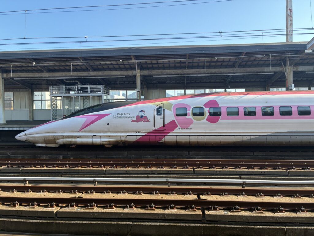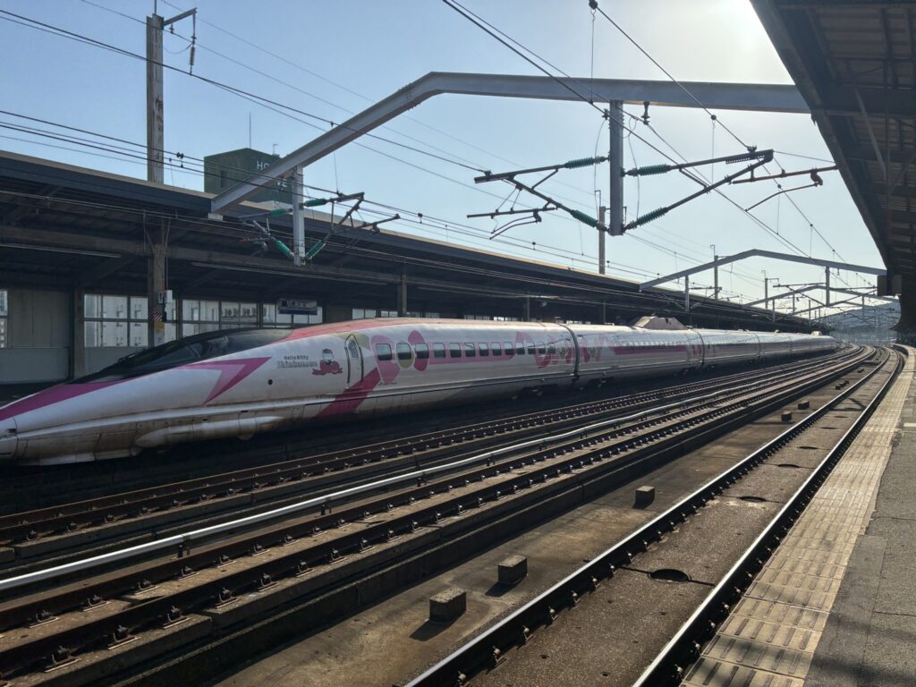新山口駅に早めに到着。ホームで待っていたらキティちゃん新幹線が!!