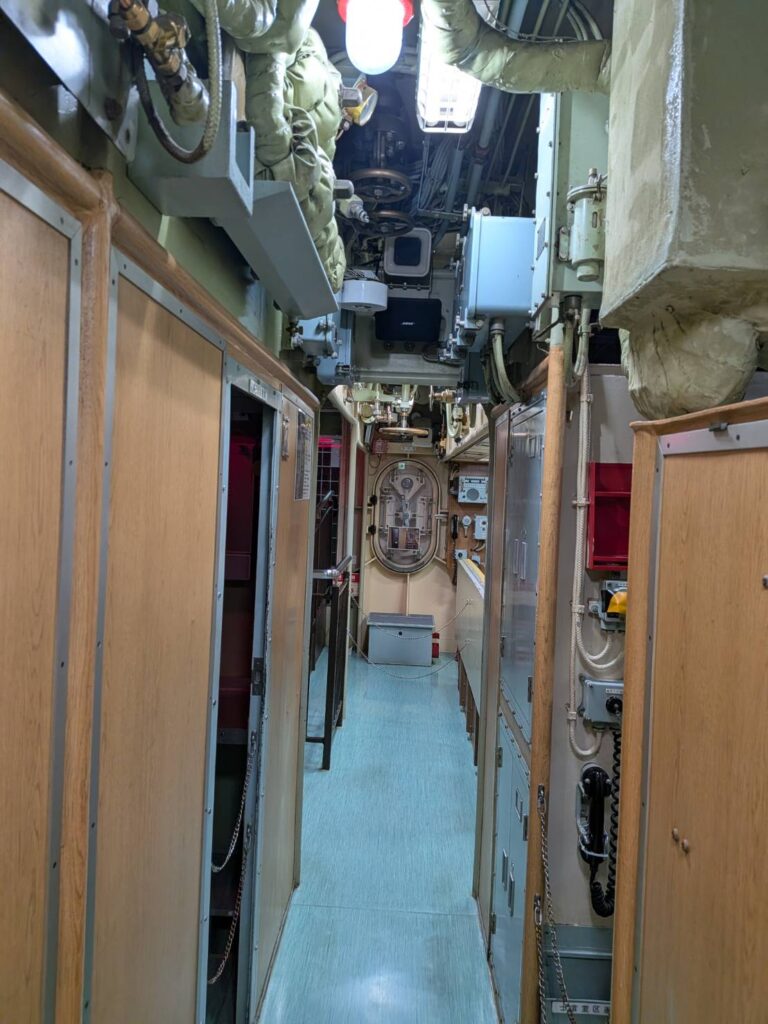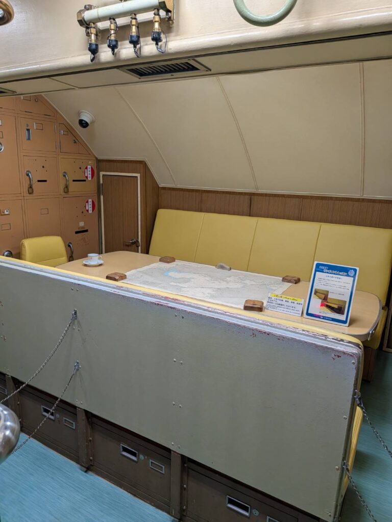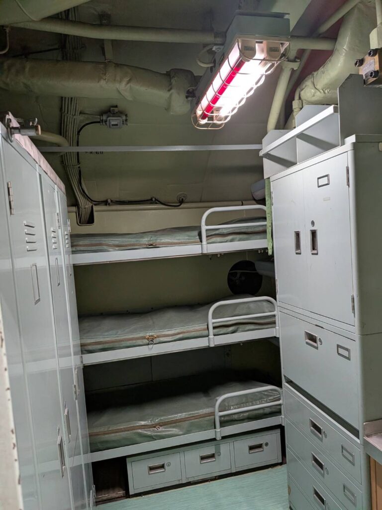 こんなに狭い所で寝泊まりして、仕事をしてきた人達!昼間は蛍光灯、夜は赤色灯と分けて朝か昼か分かるようにしてあります!なるほど〰️❣️