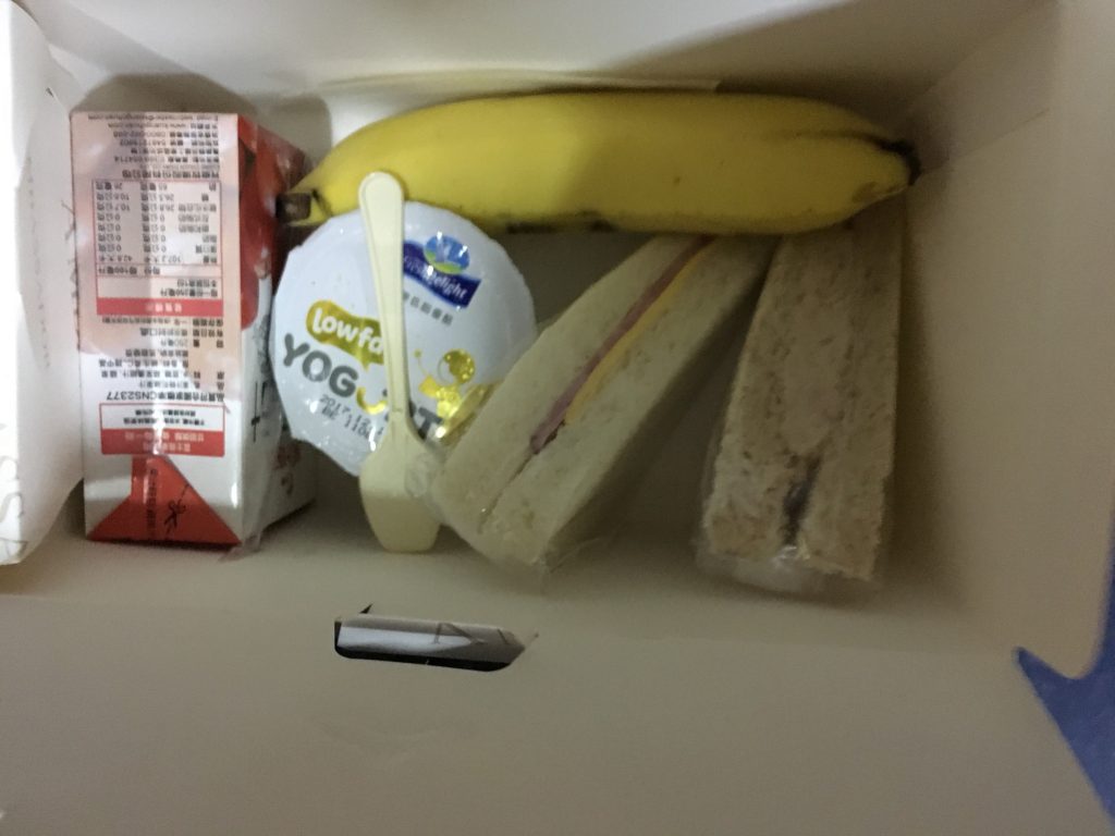 早朝ホテルから空港へ🚌バス車内でお弁当↓を食べ、桃園国際空港から富山空港へ✈