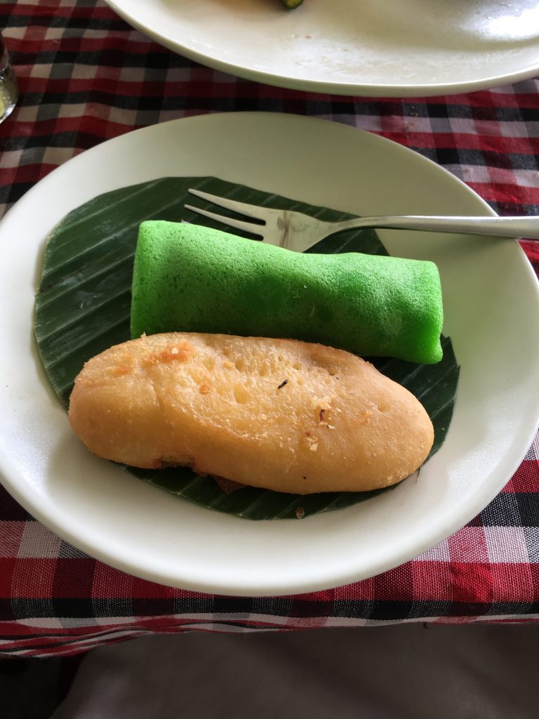黄色いのはバナナを揚げた物、緑のは中にココナッツの甘いのが入っています。