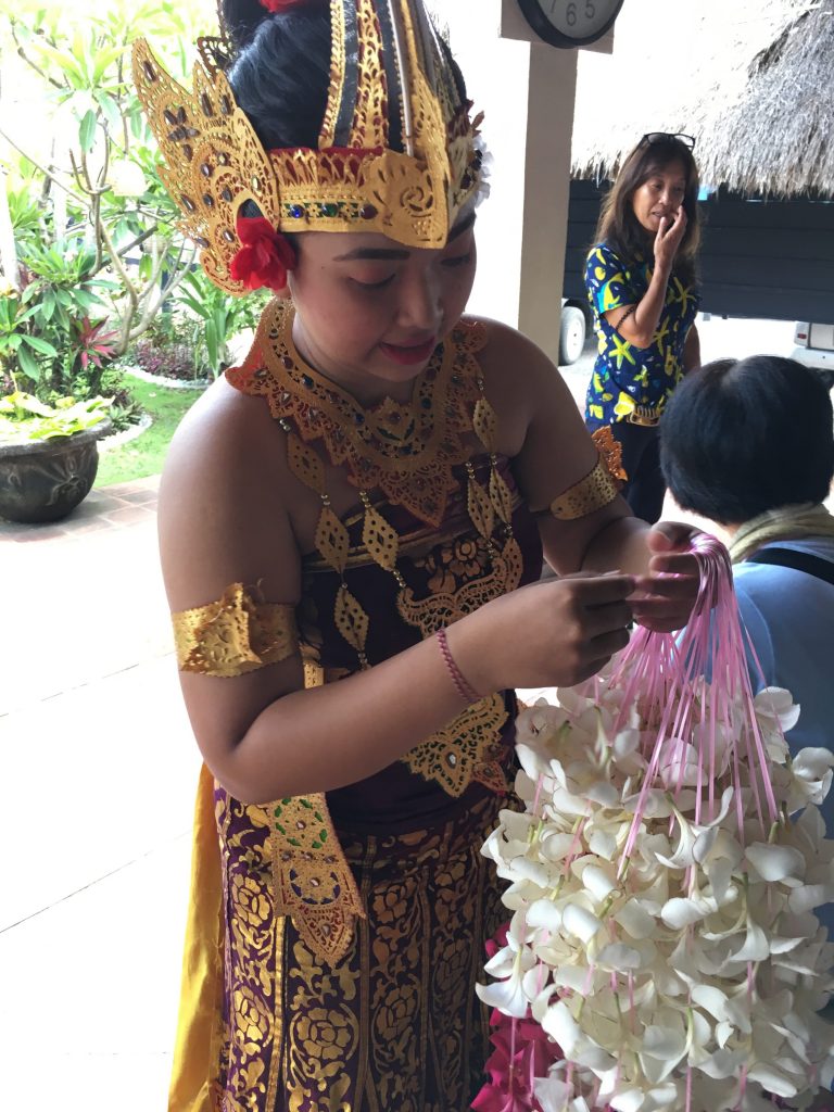 乗船前にバリのお姉さんが、プルメリアのレイをかけてくれます